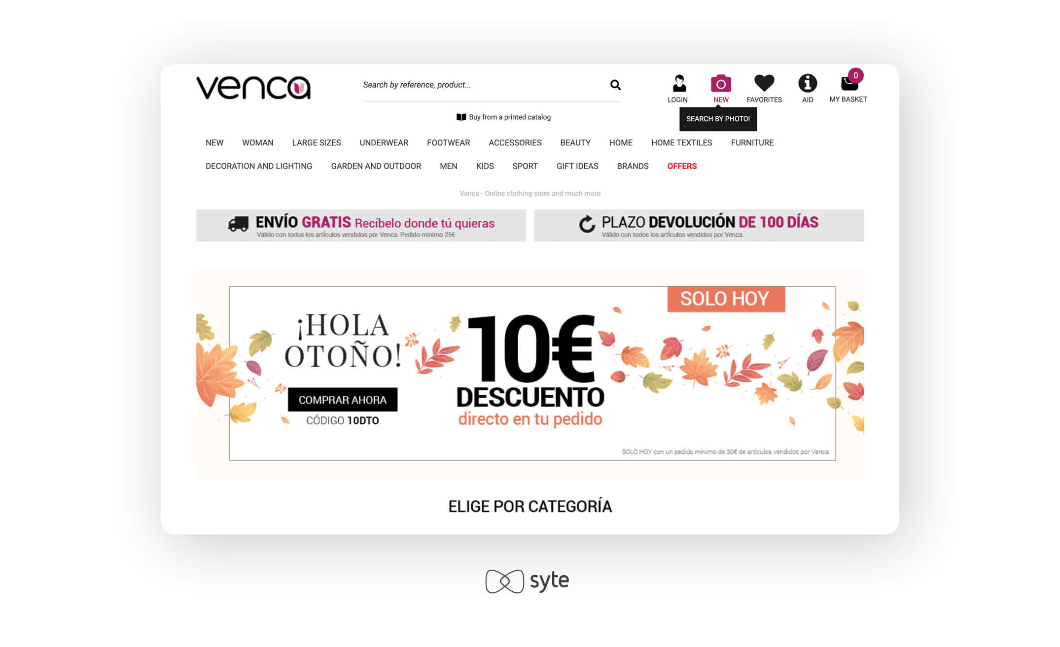 Venca, one of Spainâs top 10 fashion retailers and a Syte customer, provides shoppers with multiple ways to discover products on their site. Alongside a standard search bar, they offer Syteâs Camera Search tool, adding a unique, visual way to explore items. With clear navigation, prominently featured categories, and quick access to favorites and the shopping cart, Venca ensures a seamless and engaging browsing experience for customers.